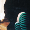 Description: black coat, green stripy stockings, and a strip of bare skin just above the knee