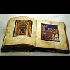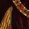 Description: Close-up of 15-century clothes; a jewelled chain and a black velvet sleeve slashed to show gold fabric inside.