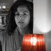 Description: Annie, entirely in grayscale except for the warm red lampshade