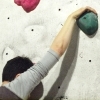 Description: A woman boulderer lunges up towards the camera for a hold.