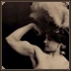 Description: 19th-C strongwoman and trapeze artist Charmion flexes her biceps while wearing a marvellous feathery hat